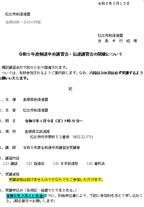 令和5年3月15日 松江市剣道連盟 加盟団体・会員の皆様 松江市剣道連盟 会長 木村昭博 件名について、添付の通りご案内致します。 ついては、受講資格が設けてないことと松江市剣道連盟が主管 ですので、たくさんの皆様の申し込みをお待ちしております。